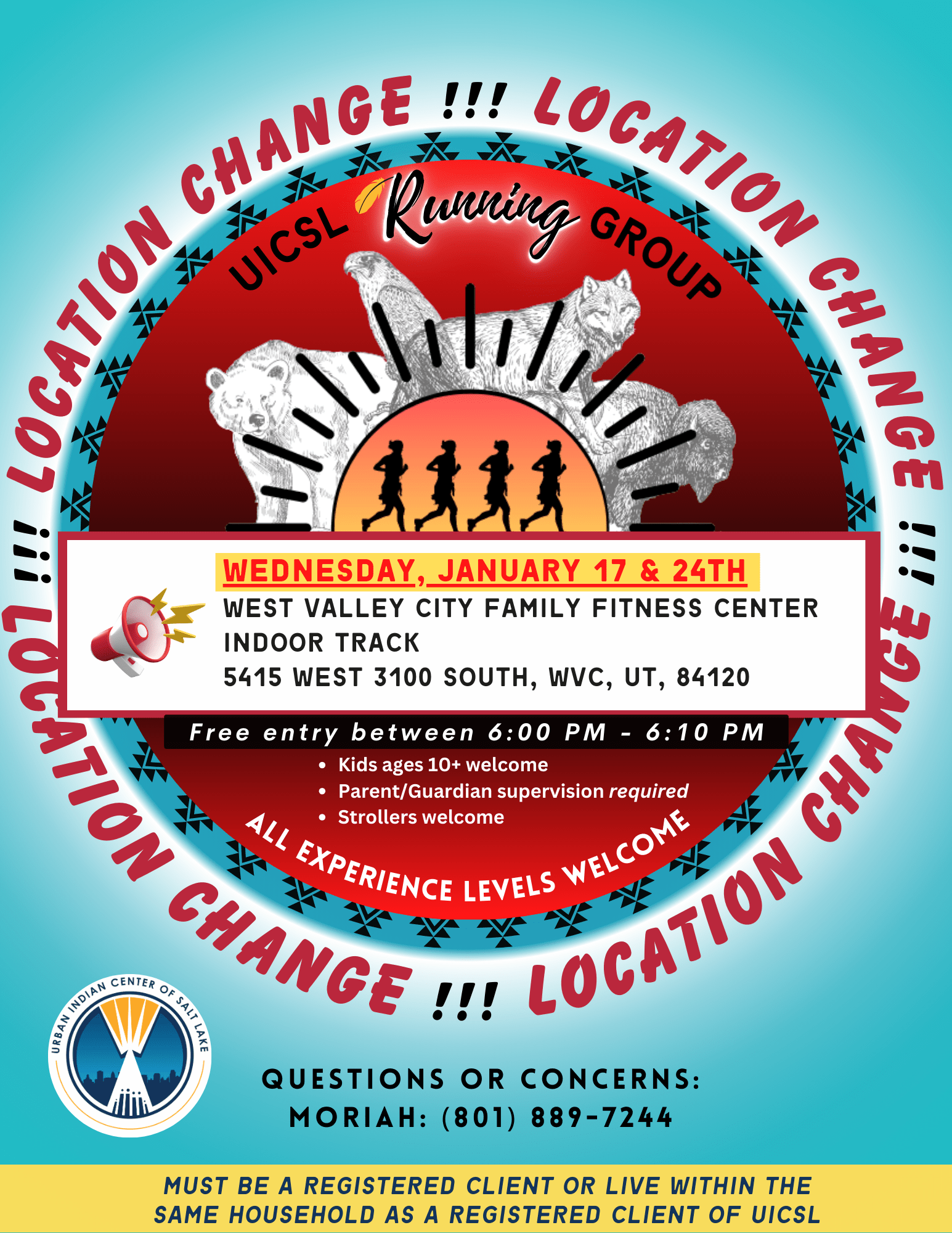 LOCATION Change: West Valley Family Fitness Center - Indoor Track Free Entry between 6:00 PM - 6:10 PM Questions or concerns: Moriah (801) 889-7244 Must be a registered client or live within the same household as a registered client of UICSL.